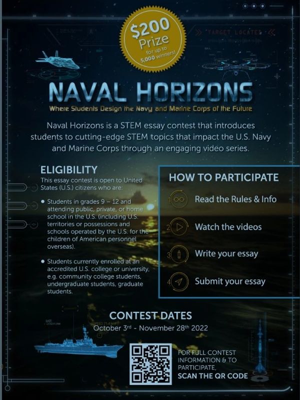 Opportunity to win $200 cash prize by just watching a Naval STEM video and writing an essay! Naval Horizons is a student essay contest introducing students to cutting-edge STEM topics impacting the U.S. Navy and Marine Corps through an engaging video series. The STEM topics in the video series include environmental science, aerospace optometry, autonomy, oceanography and more! Students are invited to watch the videos to learn about Naval STEM challenges and the scientists and engineers tackling them. Then students are tasked to write an essay explaining how the research and the STEM professional presented in the video inspired them and to share their thoughts on the future of the STEM topic.